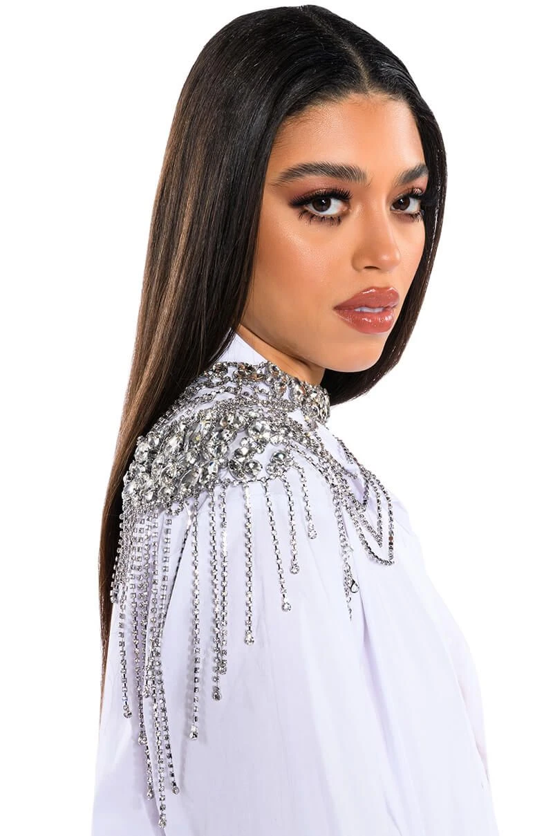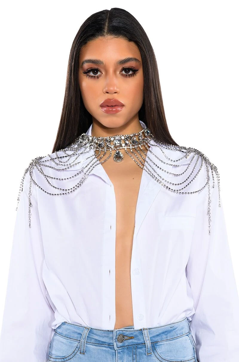 The AKIRA Label Ate That Rhinestone Shoulder Harness features a draped rhinestone link base, an ornate necklace-like collar, rhinestone gemstone accents, and a glimmering silver metallic base. This piece drapes across the chest and rests atop the shoulders. Complete with rhinestone fringe detailing and a lobster claw clasp at the back. Style atop a shirt dress for an added layer of intrigue.