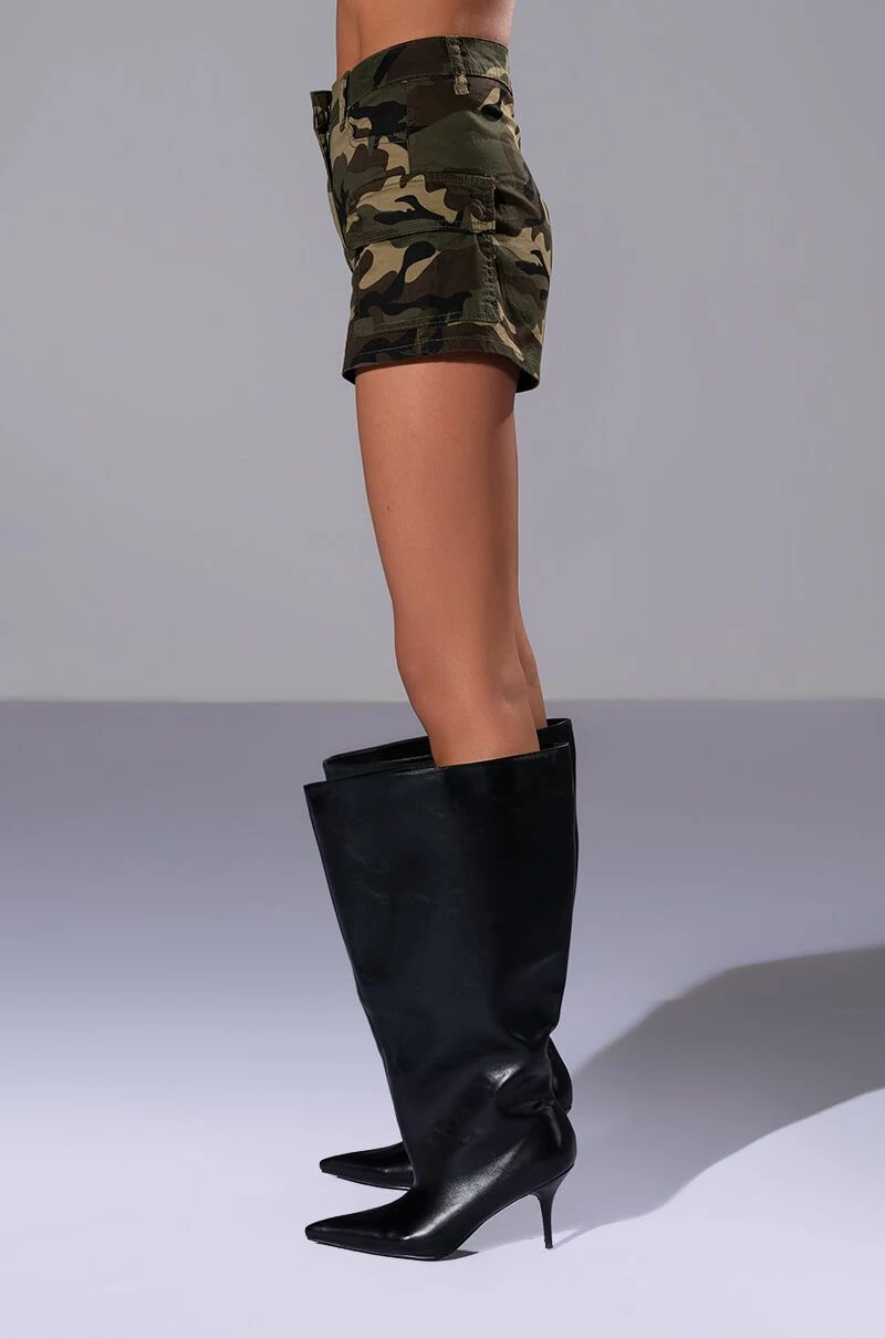 The AKIRA Label Aviator Camo Shorts feature a cotton blend fabrication, camo print patterning, a high rise waist, working belt loops, waist pockets, cargo side pockets, and a zip button closure.