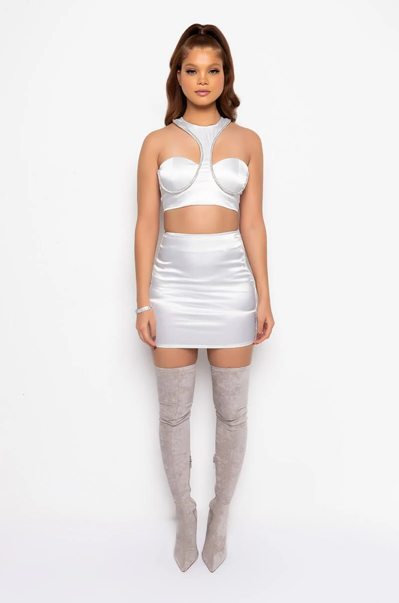 The AKIRA Label Baddie Season Satin Rhinestone Mini Skirt features a lined satin fabrication, mini length hem, and silver rhinestone tubing along the sides. Complete with an exposed back zipper. Style with the coordinating Baddie Season Satin Rhinestone Halter Crop Top.