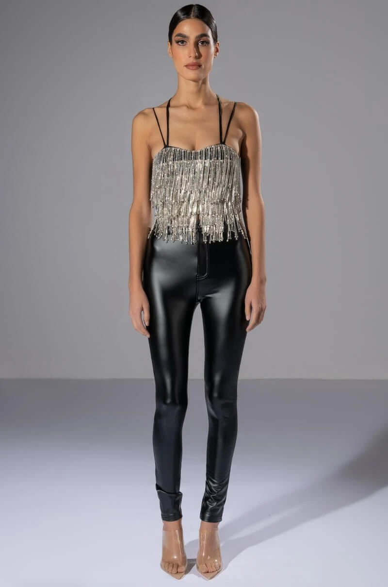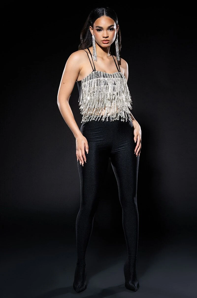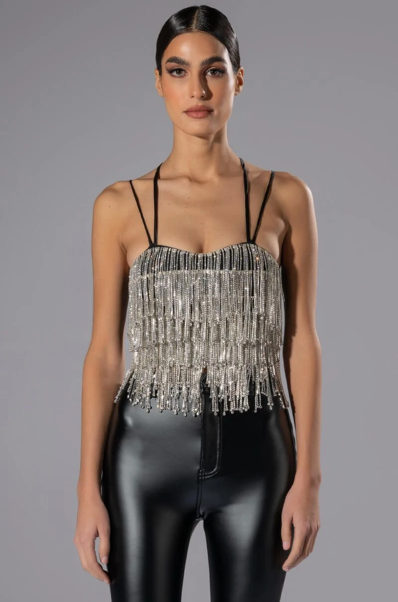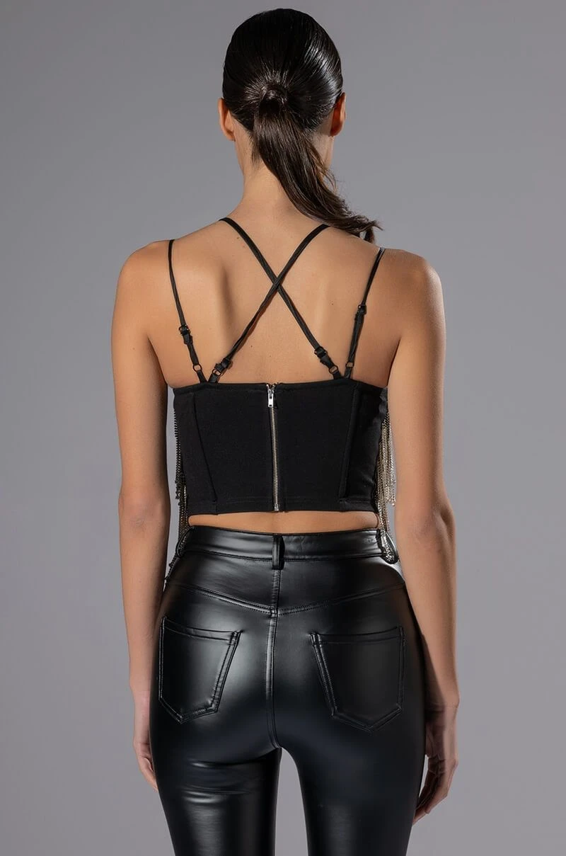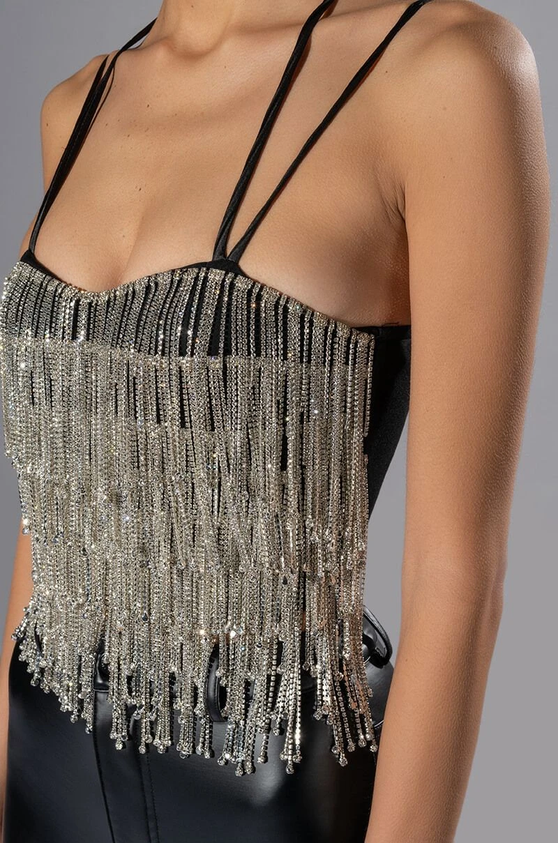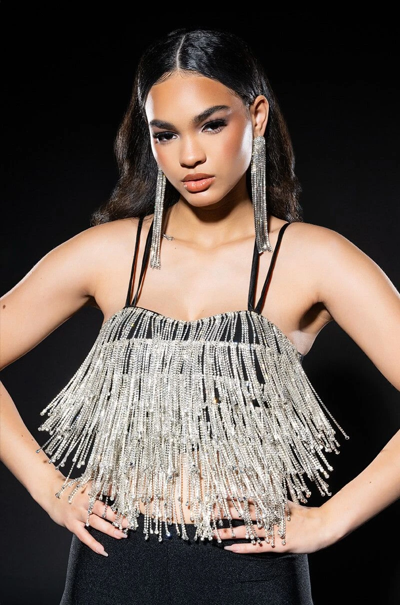 The AKIRA Label Drippin Rhinestone Fringe Corset is made from a soft, stretchy fabrication and features adjustable, satiny cross-back tank straps, a sweetheart neckline with padded cups, layered rhinestone fringe detailing, boning for structure, a cropped silhouette, and an exposed back zipper closure. Pair this piece with fitted trousers and pumps to complete your drippy look.
