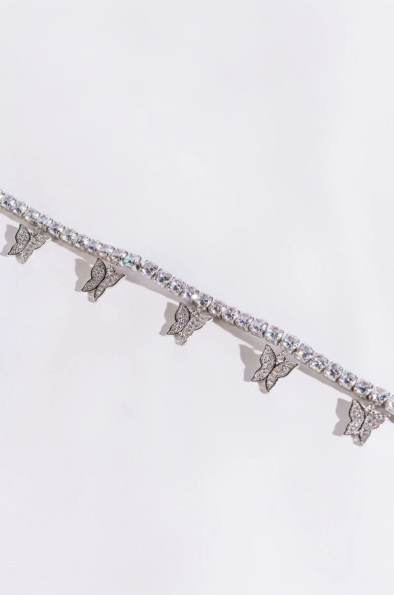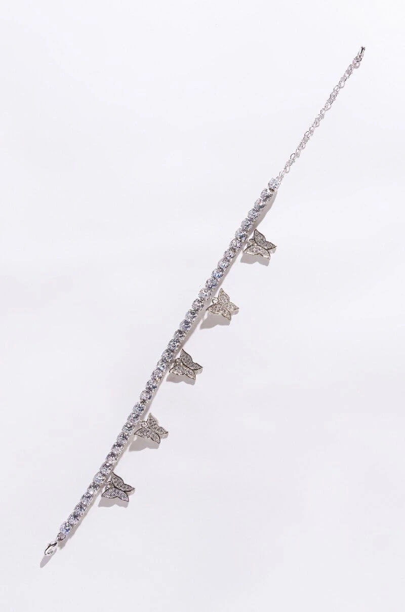 Transform your look from caterpillar to butterfly with The AKIRA Label Fly High Rhinestone CZ Anklet. This chain link piece features a silver base, cubic zirconia link silhouette, dangling pave butterfly charms, and an adjustable lobster clasp closure.