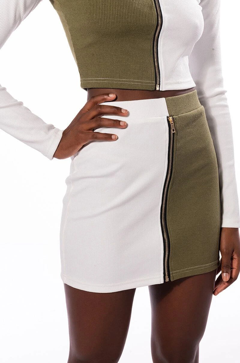 Sweet as cream, The AKIRA Label Half N Half Zipper Skirt is made from a soft ribbed knit fabrication and features a high rise waist with an elastic waistband, a sexy bodycon fit, mini length, a pull-on silhouette, and a front zipper detail. Pair this piece with the coordinating AKIRA Label Half N Half Zipper Top and booties to complete your look.