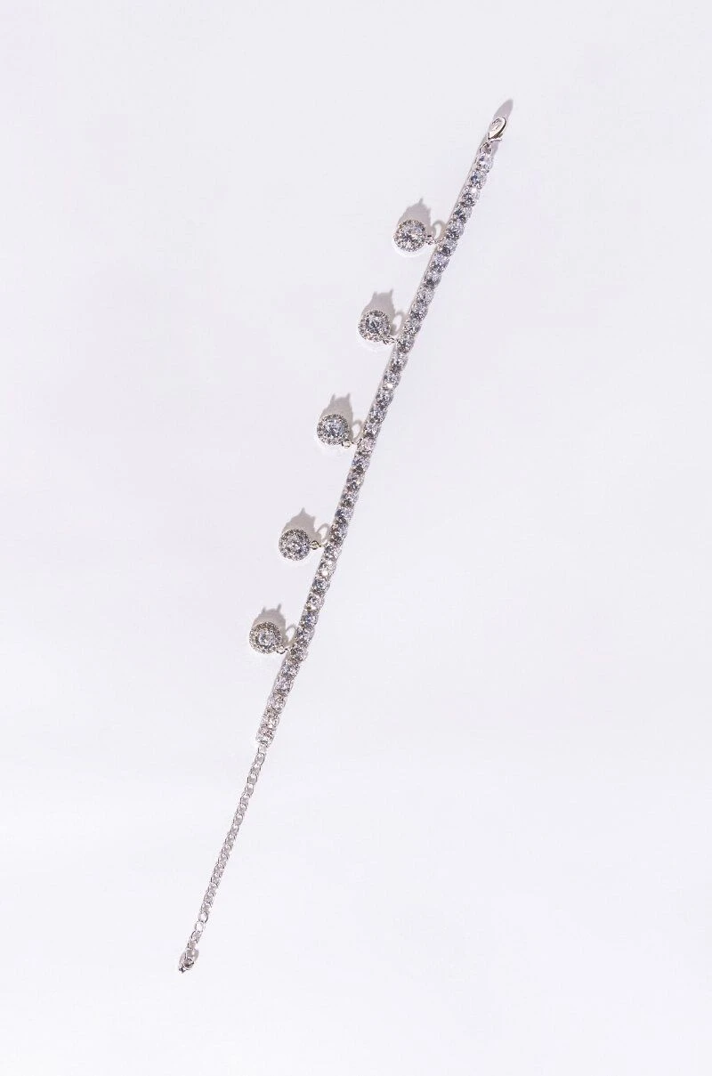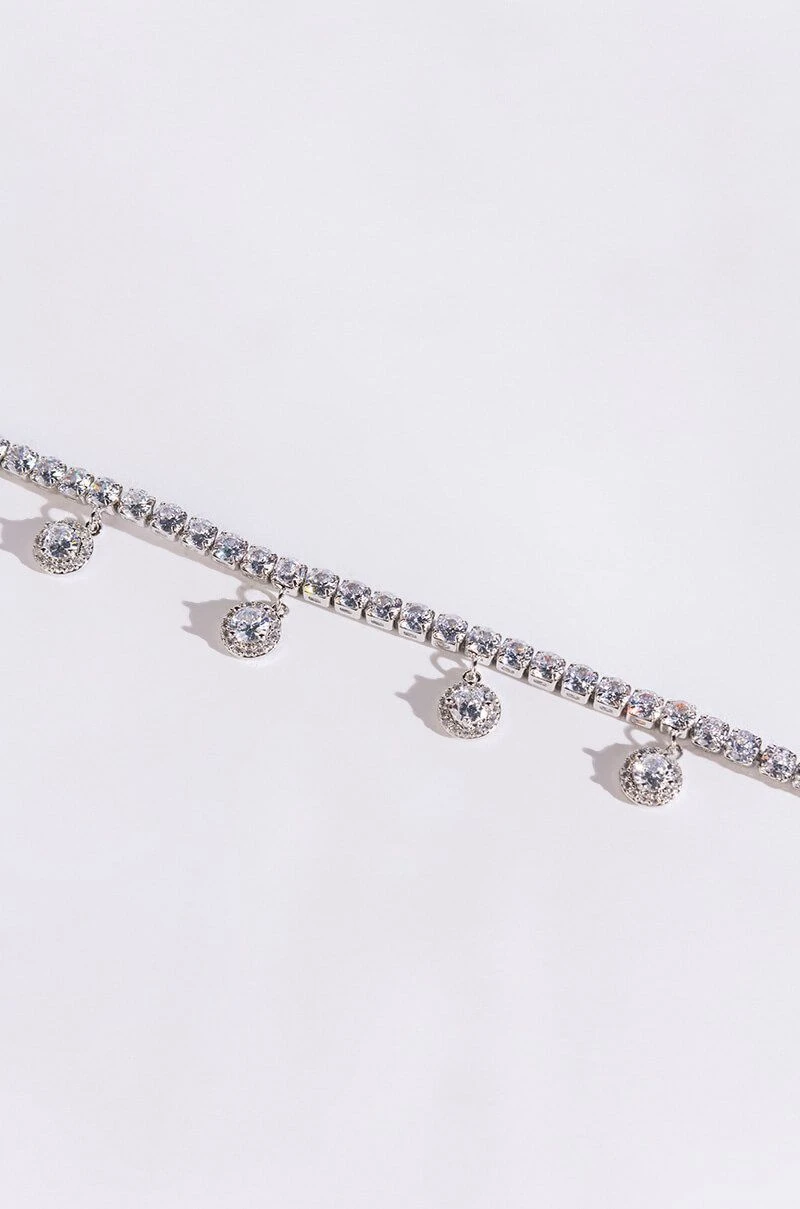 Check out all the bling in The AKIRA Label In The Details Rhinestone CZ Anklet! This chain link piece features a silver base, cubic zirconia link silhouette, dangling pave circular charms, and an adjustable lobster clasp closure.