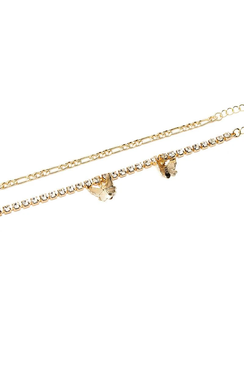 Transform your look from caterpillar to butterfly with The AKIRA Label Metamorphosis Anklet Set. Contains two unique faux gold ankle bracelets: one chain link piece and one rhinestone link anklet with dangling butterfly charms. Both complete with adjustable lobster clasp closures.