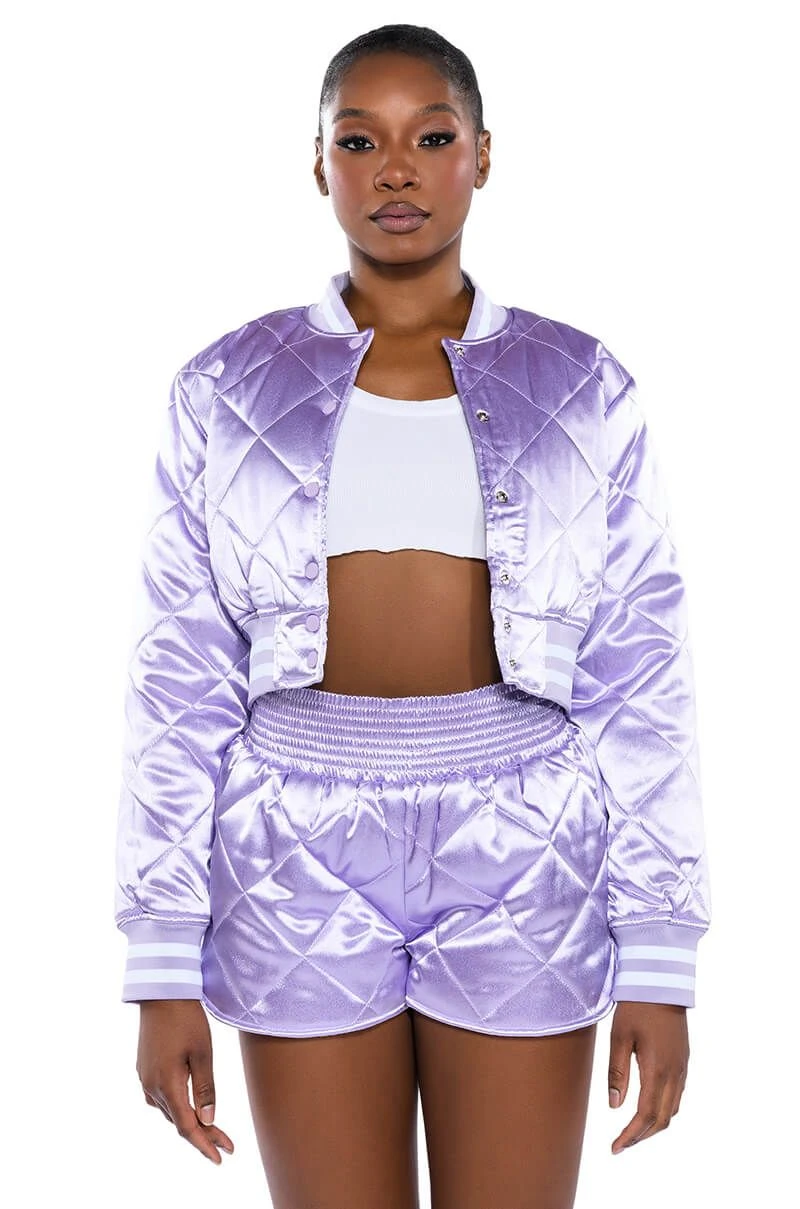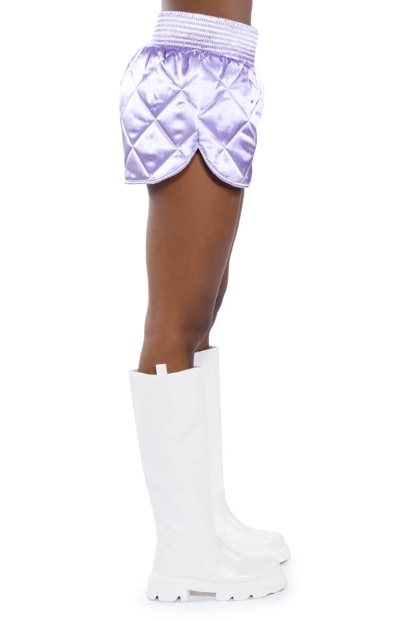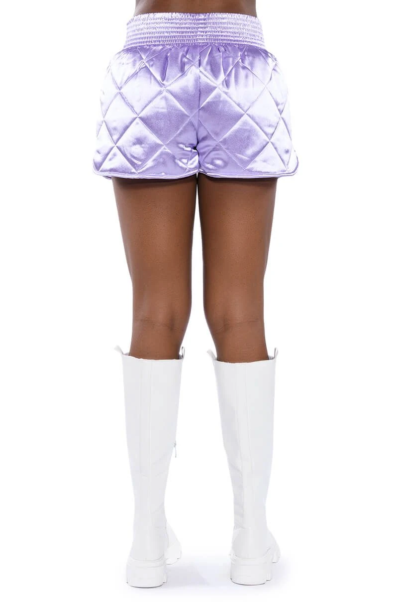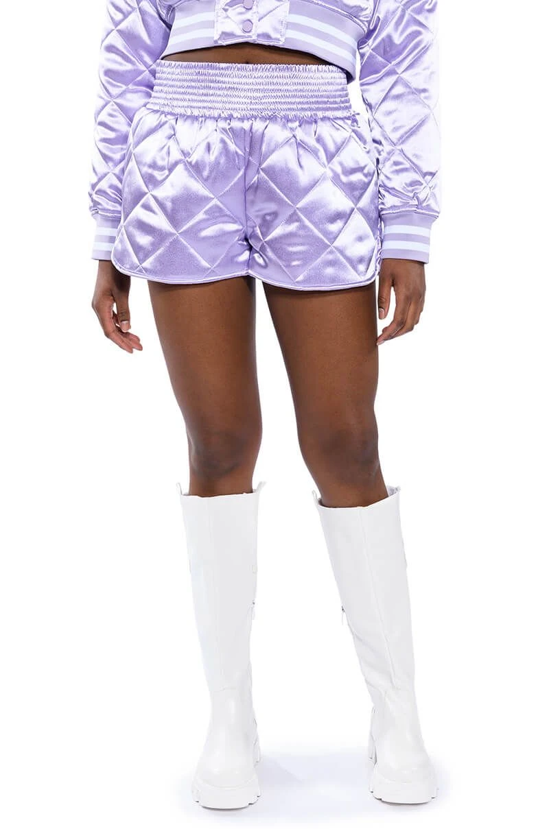 Dead ass the cutest, comfiest shorts you’ll ever own. The AKIRA Label No Cap Quilted Satin Dolphin Shorts in Lilac are a fresh take on the classic lounge short featuring a plush quilted satin fabrication, a cinched elastic high rise waist, and a dolphin short silhouette. Complete your look with The coordinating AKIRA Label No Cap Cropped Satin Varsity Bomber in Lilac.