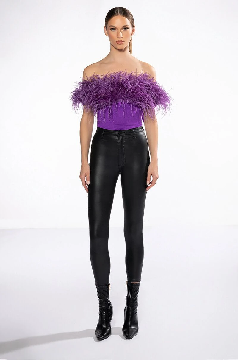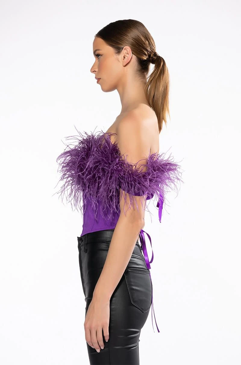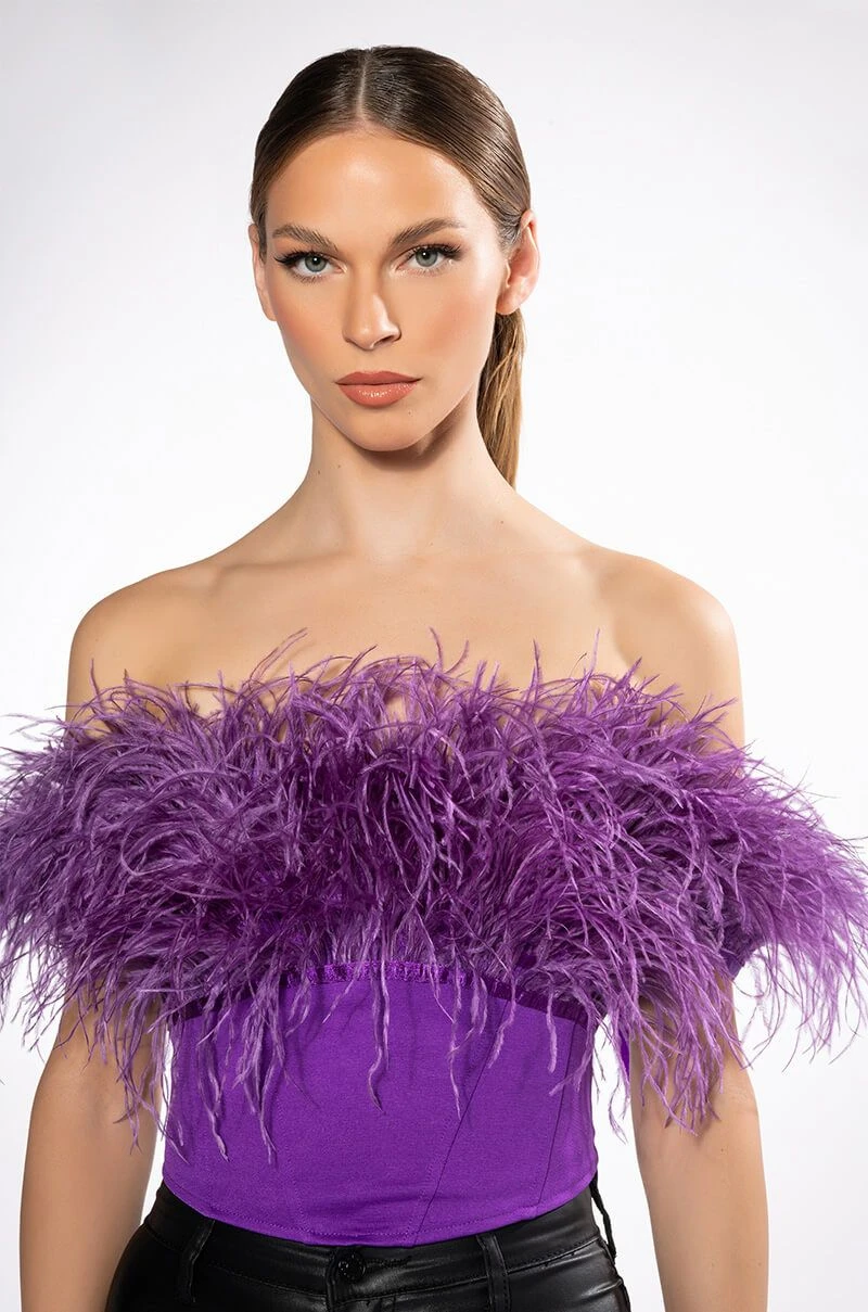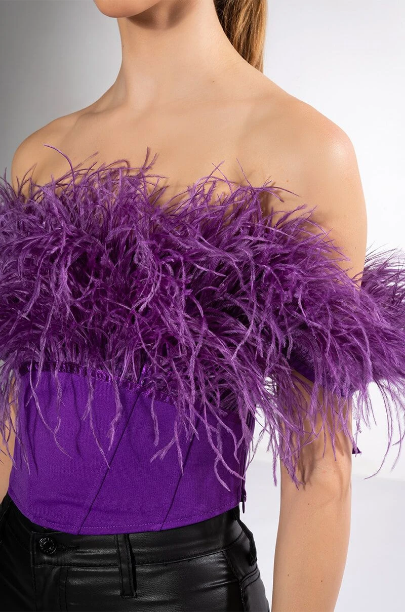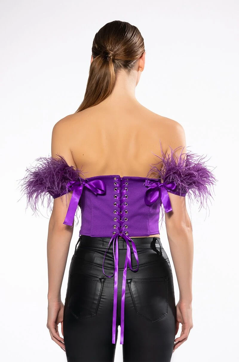 The AKIRA Label Regal Off The Shoulder Feather Corset is made from a bandage fabrication and features an off the shoulder neckline with opulent feather trim, ribbon shoulder ties, a ribbon lace up back, a cropped silhouette, a pointed hem, and a tonal side zipper closure.