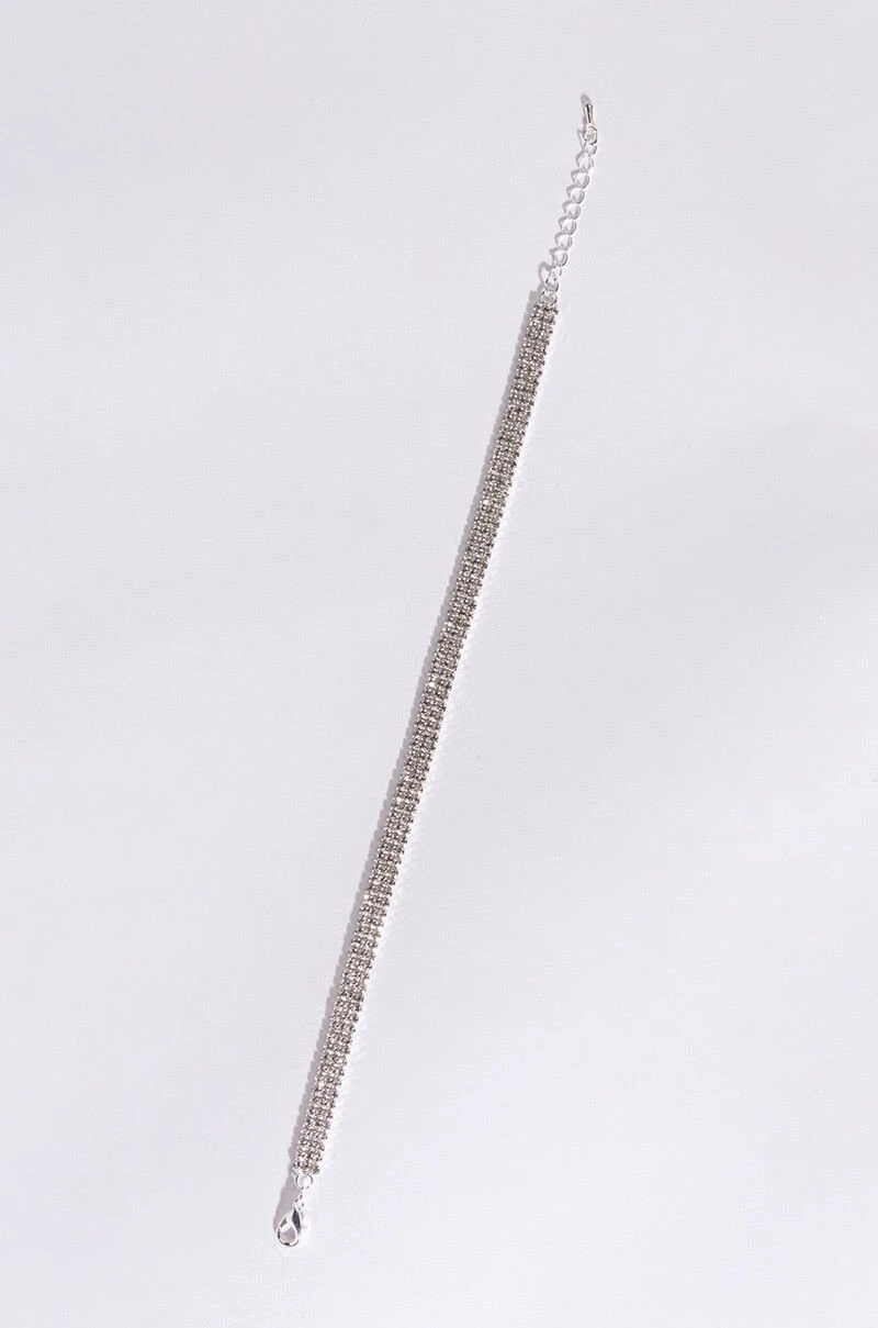 The AKIRA Label Wildest Dreams Silver Anklet features a silver metallic base, a chic rhinestone link design, and an adjustable lobster claw fastening.